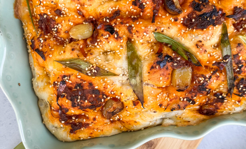 This Mamas Chili Oil Focaccia has it all- an olive oil-kissed golden crispy exterior, pillowy, and chili oil for a spicy kick! This no-knead overnight focaccia is the perfect bread for beginners and only needs basic pantry staple ingredients.